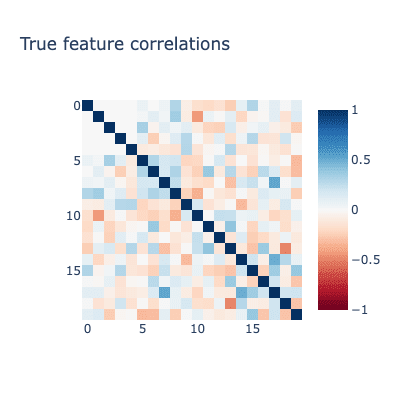 Our SAE contains 5 latents. We ensure that the first 5 true features have no correlation with each other and choose the firing threshold so these features fire about 25% of the time. We want the SAE to learn these 5 features, so we set the firing threshold lower for the remaining 15 features at around 10%. The randomly generated covariance matrix used to sample feature firings is shown below.