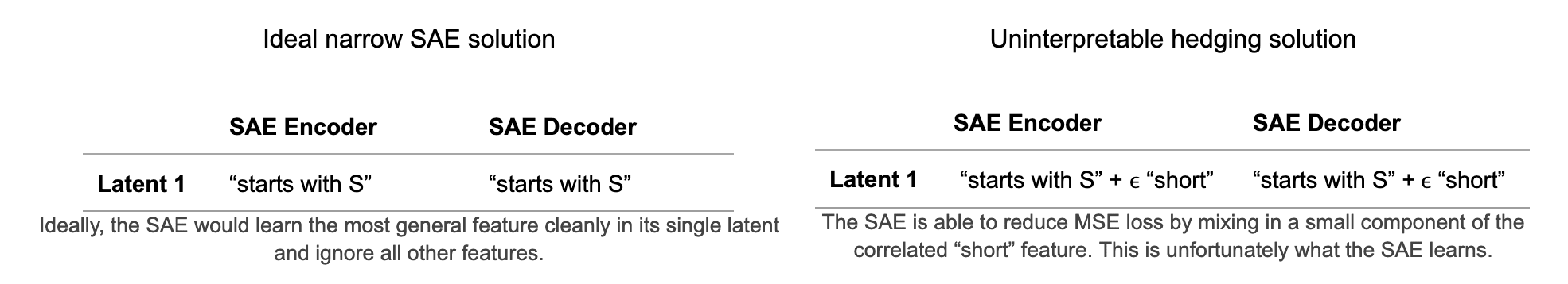 If there is any correlation between a feature captured by an SAE and a feature not captured by that SAE, the SAE will merge the external feature into its latent tracking the internal feature. This phenomenon, which we call feature hedging, is caused by MSE reconstruction loss and will happen any time the SAE is both too narrow to capture all the “true features” in the model, and there is correlation between the features tracked by the SAE and the features not tracked by the SAE. Both of these conditions are almost certainly true of every SAE trained on an LLM, especially narrower SAEs like the inner parts of Matryoshka SAEs. This means all LLM SAE latents likely have spurious components of correlated features mixed in, harming the performance of the SAE and likely contributing to the underwhelmingperformance of SAEs.