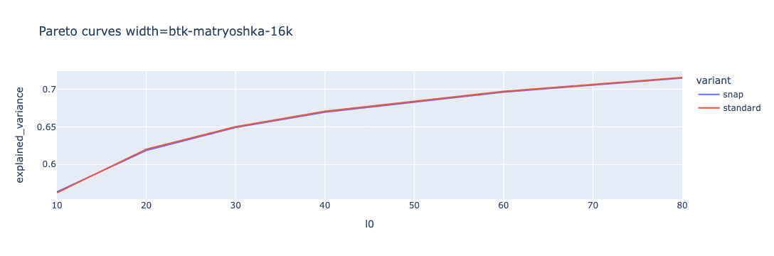 While snap loss seems to work well on toy models, it is less clear that it makes a difference on real SAEs. We train batch topk SAEs using MSE, L2, and Snap loss, as well as batch topk matryoshka SAEs using MSE loss and snap loss. The batch topk SAEs are width 8,192, and trained on 300M tokens. The topk matryoshka SAEs have width 16,384, with inner matryoshka sizes of 64, 256, 1,024, and 4,096 and are trained on 500M tokens. The pareto curves of L0 vs variance explained are shown below.