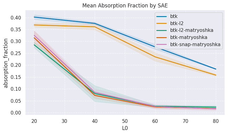 SAEBench absorption rate and absorption fraction per SAE variant. Lower is better. The Matryoshka variants all score much better than the standard SAEs, but it is not possible to distinguish the different matryoshka variants.