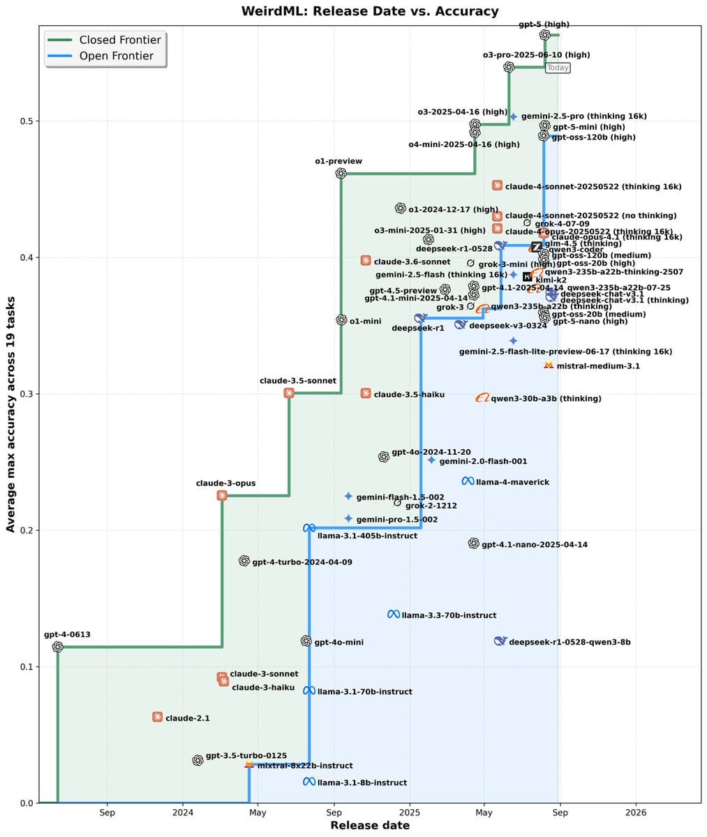 With the surprisingly high score from gpt-oss-120b (high), much of the gap between the open and closed models on WeirdML is now gone.