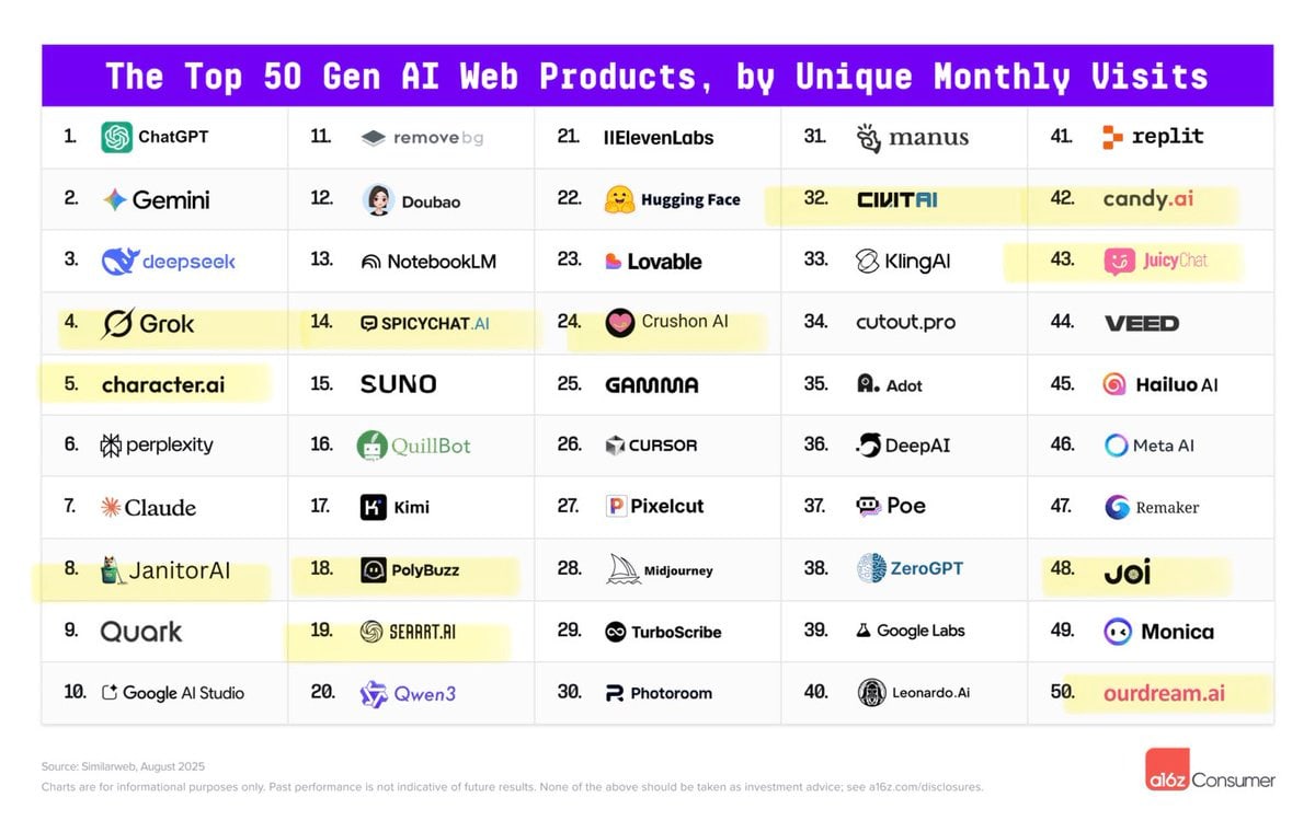 DeepSeek rapidly got to 600 million monthly web visits after r1’s release, but use peaked by February and is slowly declining, now under 400 million, with v3 and v3.1 not visible. We’ll see if r2 causes another spike. The app peaked later, in May, and there it is only down 22% so far from peak.