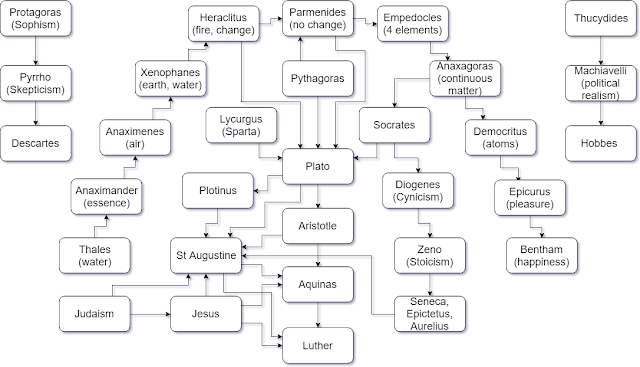 I also made a rough diagram of the flow of intellectual influence through the ages—again focusing on ancient philosophers, but with a few modern ones thrown in when there was a particularly strong link. Philosophers most associated with one big idea or virtue have it noted beneath them. The graph is surprisingly neat (and planar!), no doubt because I’ve simplified a lot of relationships and overlooked many more—don’t interpret this as anything more than an outline.