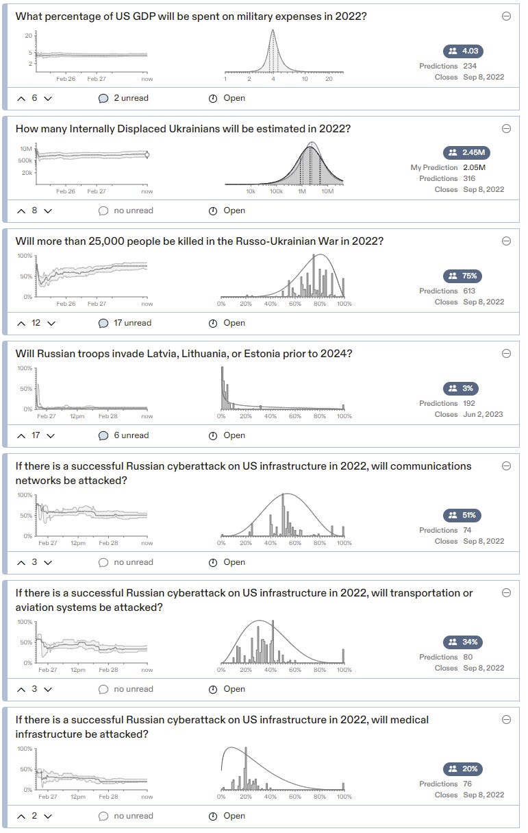 To me the most important questions to be asking first are the tail risks. What are the chances that things get much, much worse? How seriously should we consider relocating or taking other actions in case this becomes World War 3? The problem is that prediction markets are terrible at differentiating 1% from 3% due to time value of money and bias and various other issues, and now there’s additional issues since the world state is very different under different outcomes.