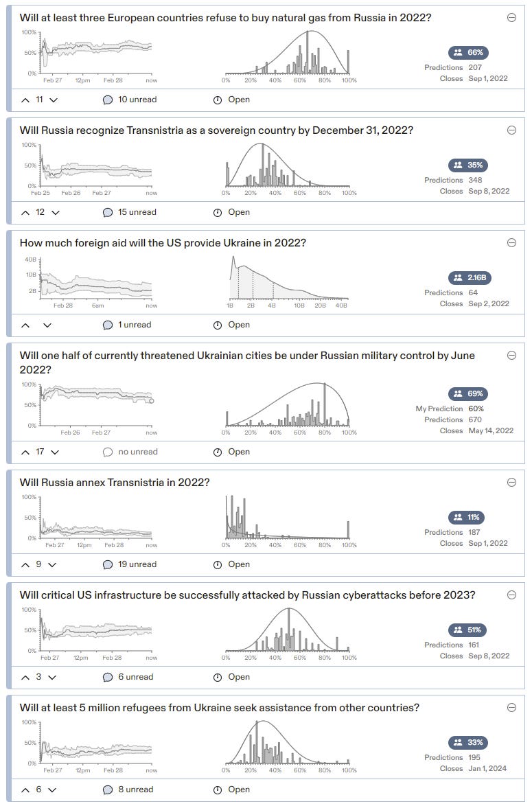 I did quickly make predictions in a few Ukraine-related markets, and it didn’t feel like I was at all being incentivized to reveal my true estimates, and did feel like I was supremely anchored to existing predictions. And now am I going to go back and continuously update? I doubt it. And I definitely don’t expect most people to actually make their distributional estimates match their actual distributions that carefully due to the workload required.