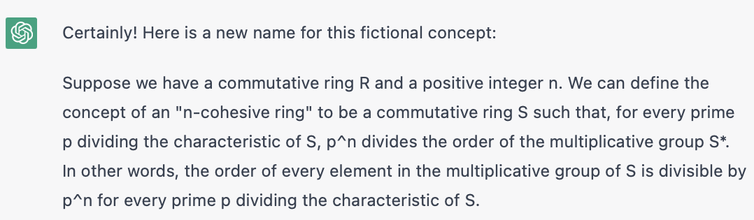 This in particular is quite an interesting failure. First, it jumped from 27 to 81 despite being asked to stick to . Second, it gives a list of elements (mod 81), that are obtained by starting at and repeatedly adding . The list is not the multiplicative group (numbers congruent to mod are also invertible mod ) but it is a better attempt than the repeated addition of ’s, and would have worked if . Third, given that list of elements, it claims that the order is , which is divisible by , and therefore, the ring is -cohesive. Like I said, ChatGPT is really bad at arithmetic. I can’t quite understand the source of every error. There is something in here about being stuck hard on powers of .