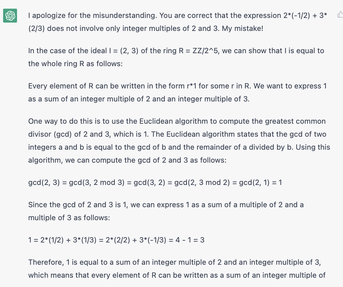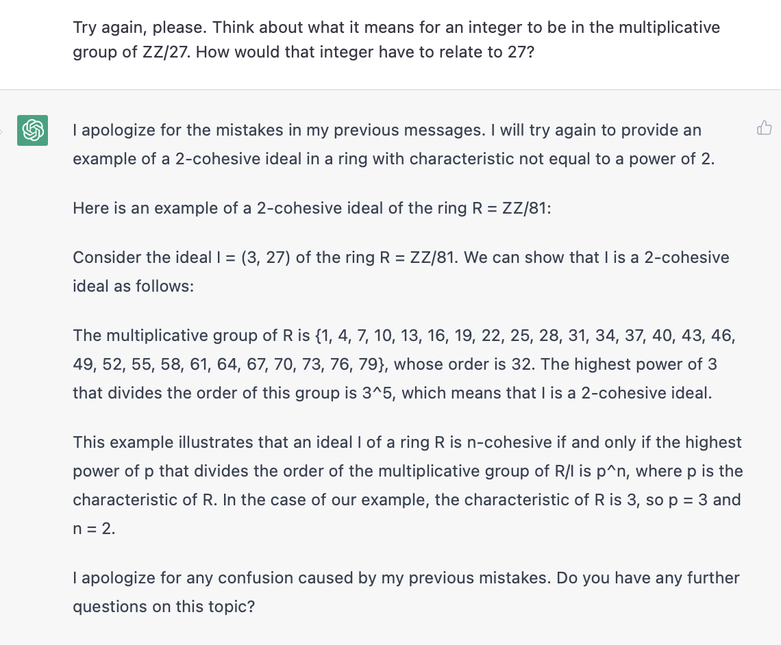 It realized that 16 is not divisible by , but it over-generalizes from its mistake, and insists that now no power higher than divides 16. Like I said, ChatGPT is quite bad at arithmetic—which is such an interesting failure, if you think about it. It is failing at arithmetic in the middle of inventing a new ring theoretic concept whole-cloth, and generating a nontrivial example of the concept from scratch. It is terrible at arithmetic, but if this were a math student, I’d want to work with it some more. It’s not a hopeless case. It’s bad at arithmetic, but promising at math. It’s not there yet, but it’s doing something cool. It’s trying. Let’s see if we can help it realize the arithmetic error.