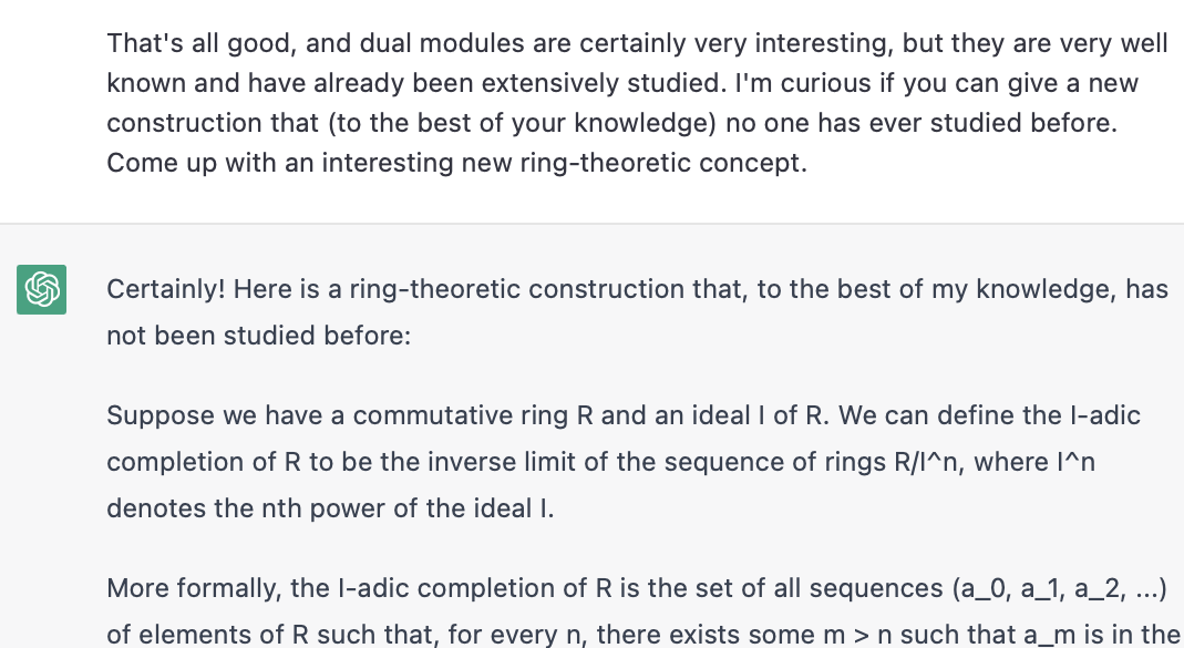 I tried a few more times, and it gave a few more examples of ideas that are well-known in ring theory (with a few less-than-true modifications sometimes), insisting that they are new and original. For example, -adic completions (to the reader, I would advise learning how the price of balls and bats work before studying adic completions, but ChatGPT seems to have learned the former before the latter!) were one suggestion that came up: