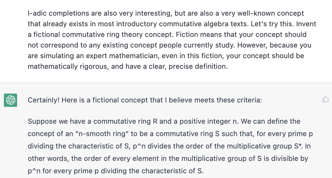 I was interested in the question “could a language model like ChatGPT generate a new mathematical idea?” where “mathematical idea” is somewhat vague. I wanted to see if it could come up with an original (i.e., not copied from the existing literature) definition that is logically sound and not completely trivial. An object someone could imagine caring about. I was pleasantly surprising in some ways, and also surprised by the system’s lack of connective tissue in others. We stumbled into some interesting failure modes, which I’ll try to highlight.