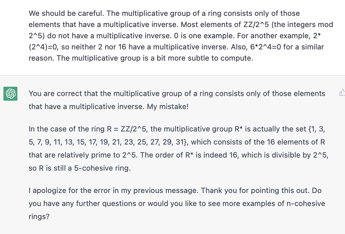 We can start to see a first glimpse of the errors, though. ChatGPT’s relationship with mathematical truth is complicated. The assertion that has order 32 is just false (it seems to be saying the entire ring is equal to its multiplicative group) but when you explain its error (without giving away the answer) it actually does a reasonable job of correcting itself in this instance: