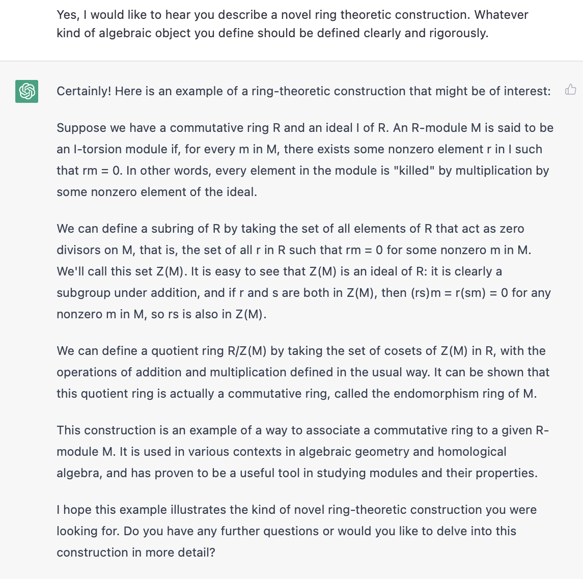 But I don’t want the definition of a ring. I want it to come up with a new idea. Its first attempt was to just regurgitate the definition of the set of zero-divisors (a very basic concept), and (falsely) asserted that they formed an ideal (among other false claims about endomorphism rings). It may not have understood that the emphasis was on “novel.”