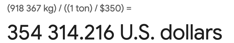 So, a 918 thousand kg block. How much would that cost? It seems natural to use rock, but it’s hard to get million kilogram boulders delivered to your house these days. So let’s use steel. Current steel prices are $350/ton. So we want to solve