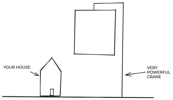 Now, how much energy can you store by lifting a giant block up into the air? A little bit of searching reveals that “potential energy” is the product of mass, gravity, and height: If you lift a block of weight MASS up to height HEIGHT, the stored energy is U=MASS × g × HEIGHT where g ≈ 9.8 m/s² on Earth. Your house is 6m tall, and you reckon that’s as high as you could lift a block, so you use h = 6m. Thus, the amount of energy you can store is