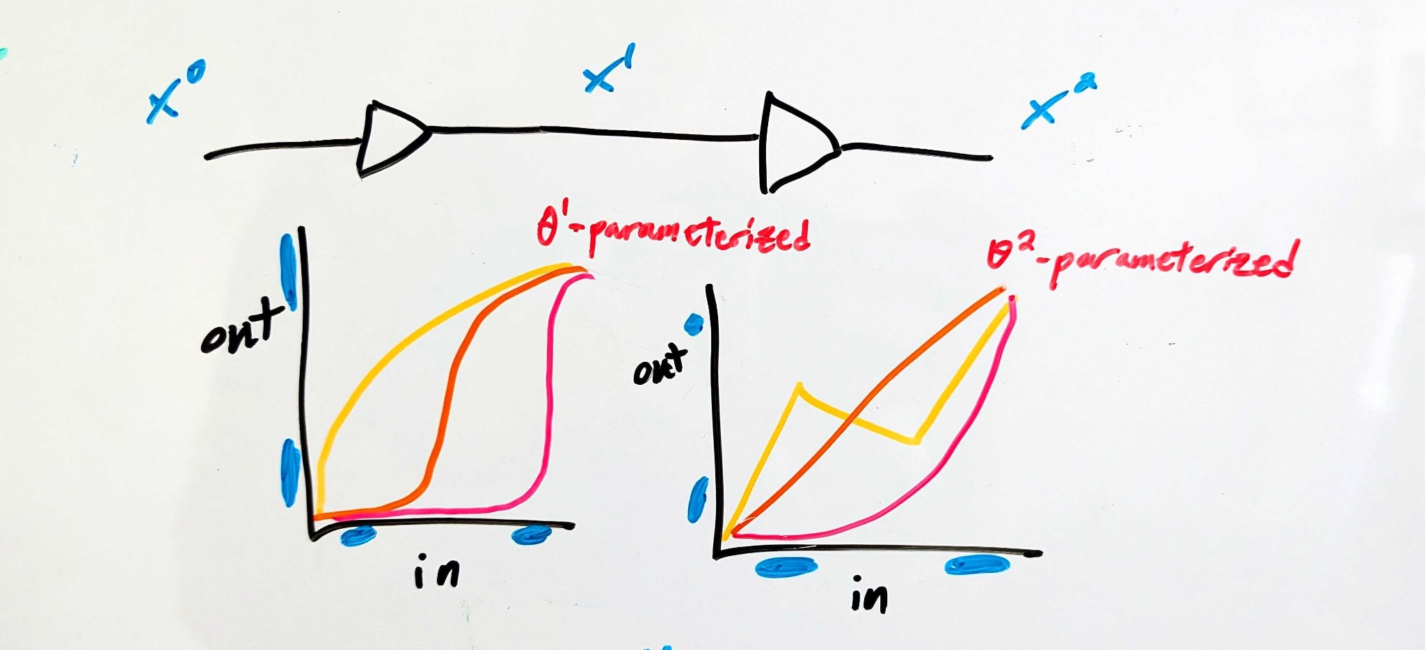 Imagine using an ML-like training process to design two simple electronic components, in series. The parameters control the function performed by the first component, and the parameters control the function performed by the second component. The whole thing is trained so that the end-to-end behavior is that of a digital identity function: voltages close to logical 1 are sent close to logical 1, voltages close to logical 0 are sent close to logical 0.