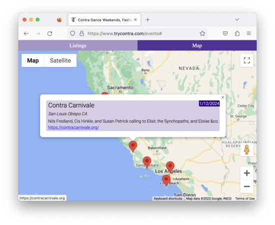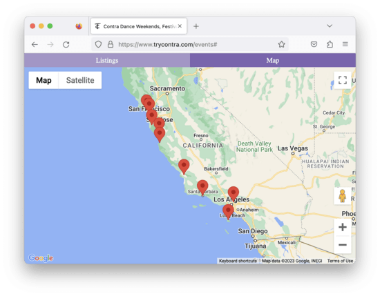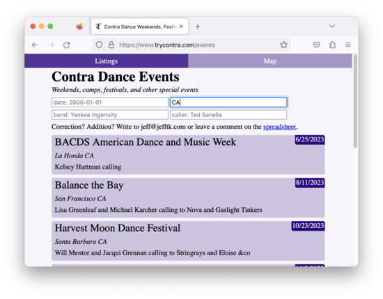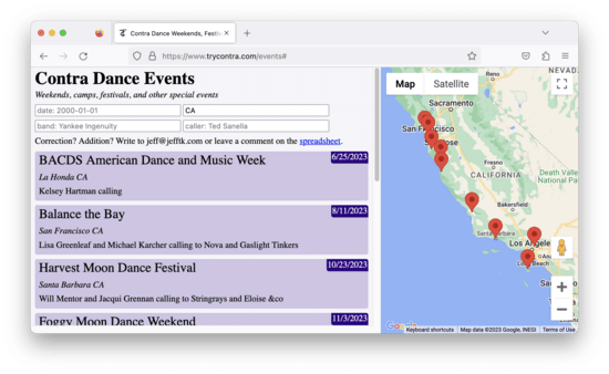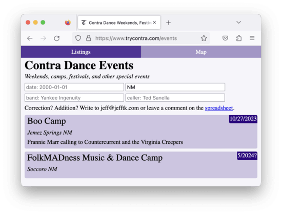 I’ve been maintaining a spreadsheet of contra dance events for a while. With the end of the Dance Gypsy, and ContraDanceLinks going stale, however, people asked if I could convert this into something more usable. So! Here’s trycontra.com/​events: