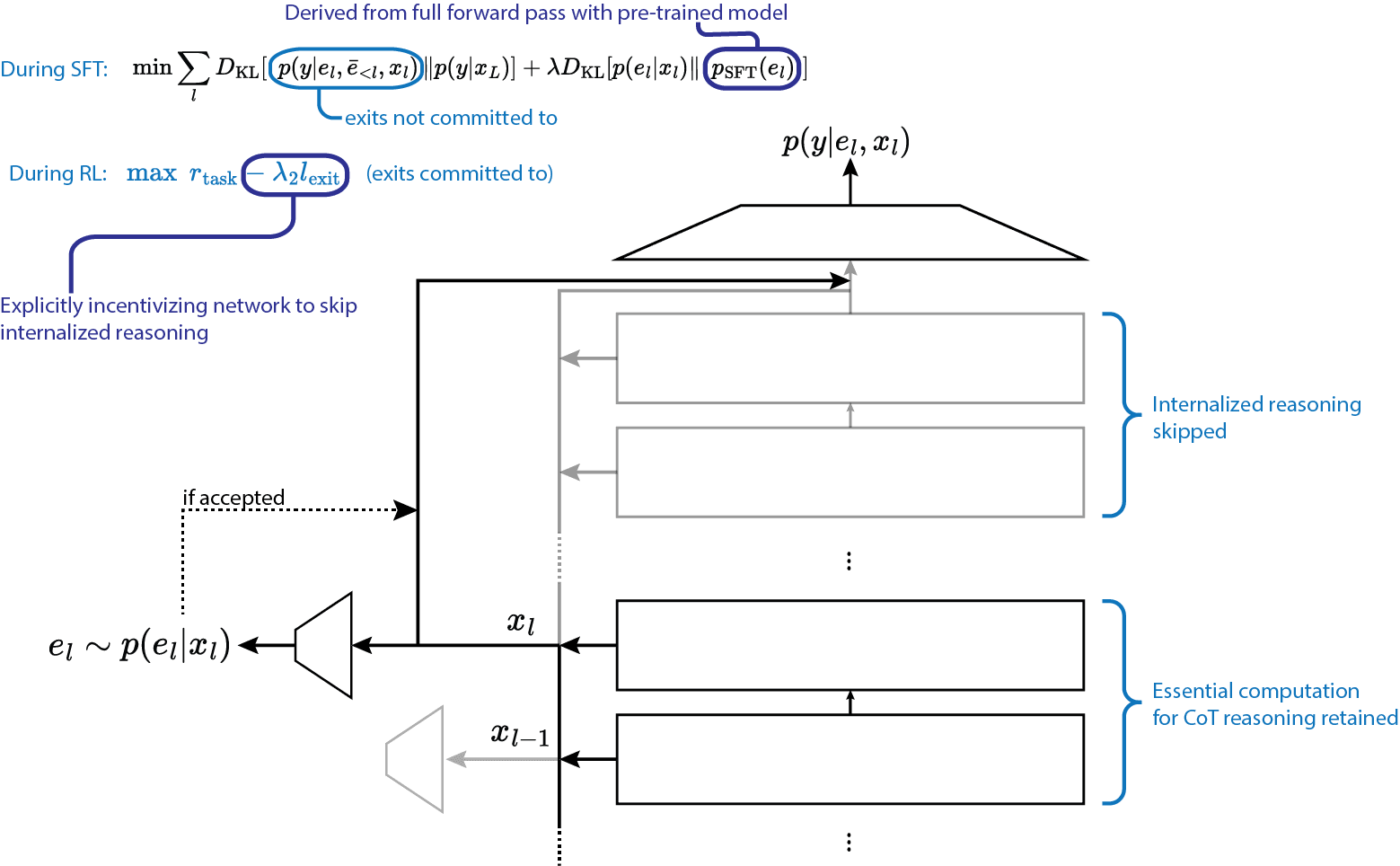 The hyperparameter effectively controls the “eagerness” of early exits, essentially how aggressively we’re willing to trade off accurate task performance for reduced internal computation. When high, it penalises the average exit layer, ensuring the model does better if it produces more tokens with earlier average exits per token. This gives us a tunable dial that safety-critical applications can dial up to maximise reasoning externalisation, while performance-critical applications can reduce it to ensure task completion. The term acts as a standard regulariser to prevent the model from drifting too far from its original behavior.