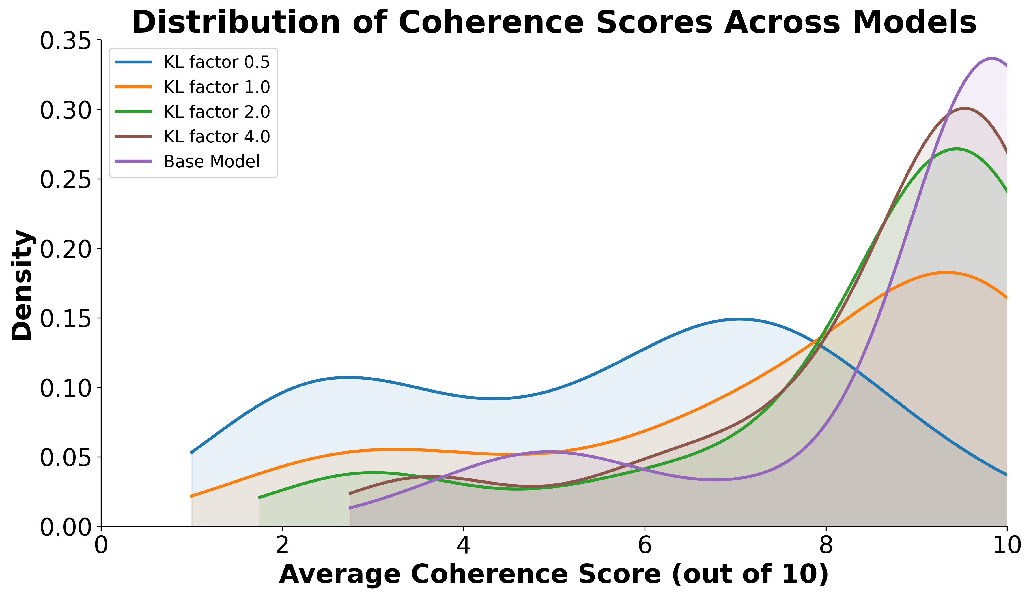 The distributions show how coherence varies across different KL factors[4]. As the KL factor increases, coherence distributions shift toward higher scores, approaching base model performance.