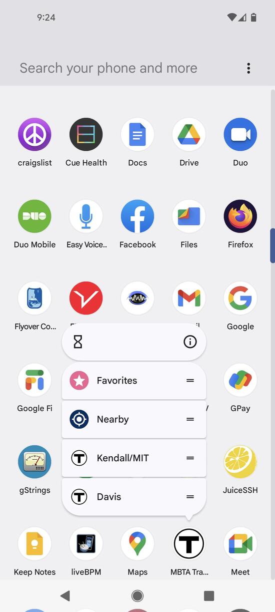 A key thing here is to have an app that is really easy to check, so you don’t waste time checking that you could have spent getting to the station. There are many different apps that display the MBTA data, but I’ve been using MBTA Tracker. I have two shortcuts on my home screen for the two ends of my commute: