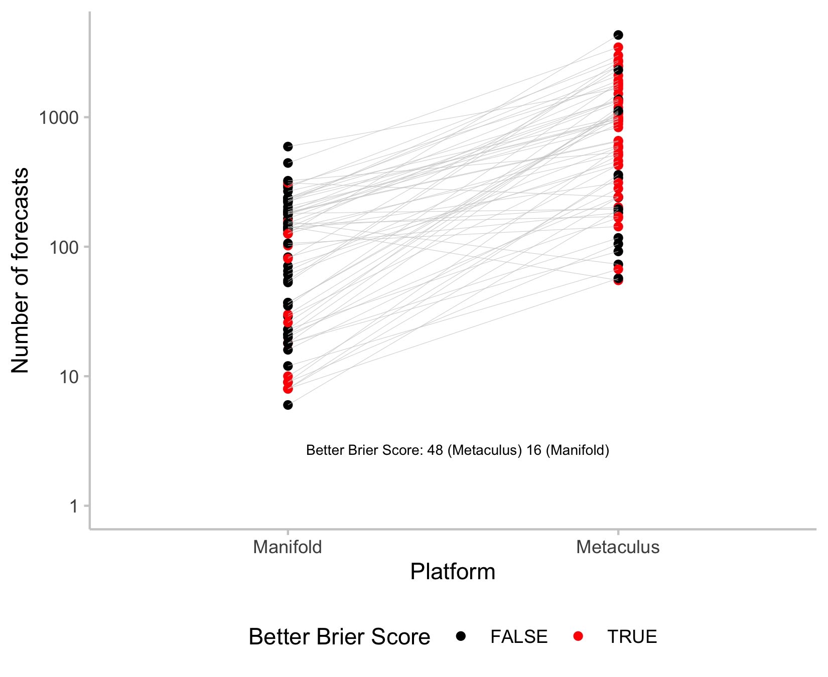I find this interesting, but also somewhat hard to identify any meaningful patterns. For example, one could expect red points to be clustered at the top for Manifold, indicating that more forecasts equal better performance. But we don’t see that here. The comparison may be somewhat limited anyway: In the eyes of the Metaculus community prediction, all forecasts are created equal. On Manifold, however, users can invest different amounts of money. A single user can therefore in principle have an outsized influence on the overall market price if they are willing to spend enough. I’d be interested to see more on how accuracy on Manifold changes with the number of traders and overall trading volume. Who knows, maybe Manifold would be ahead if they had a similar number of forecasters to Metaculus?