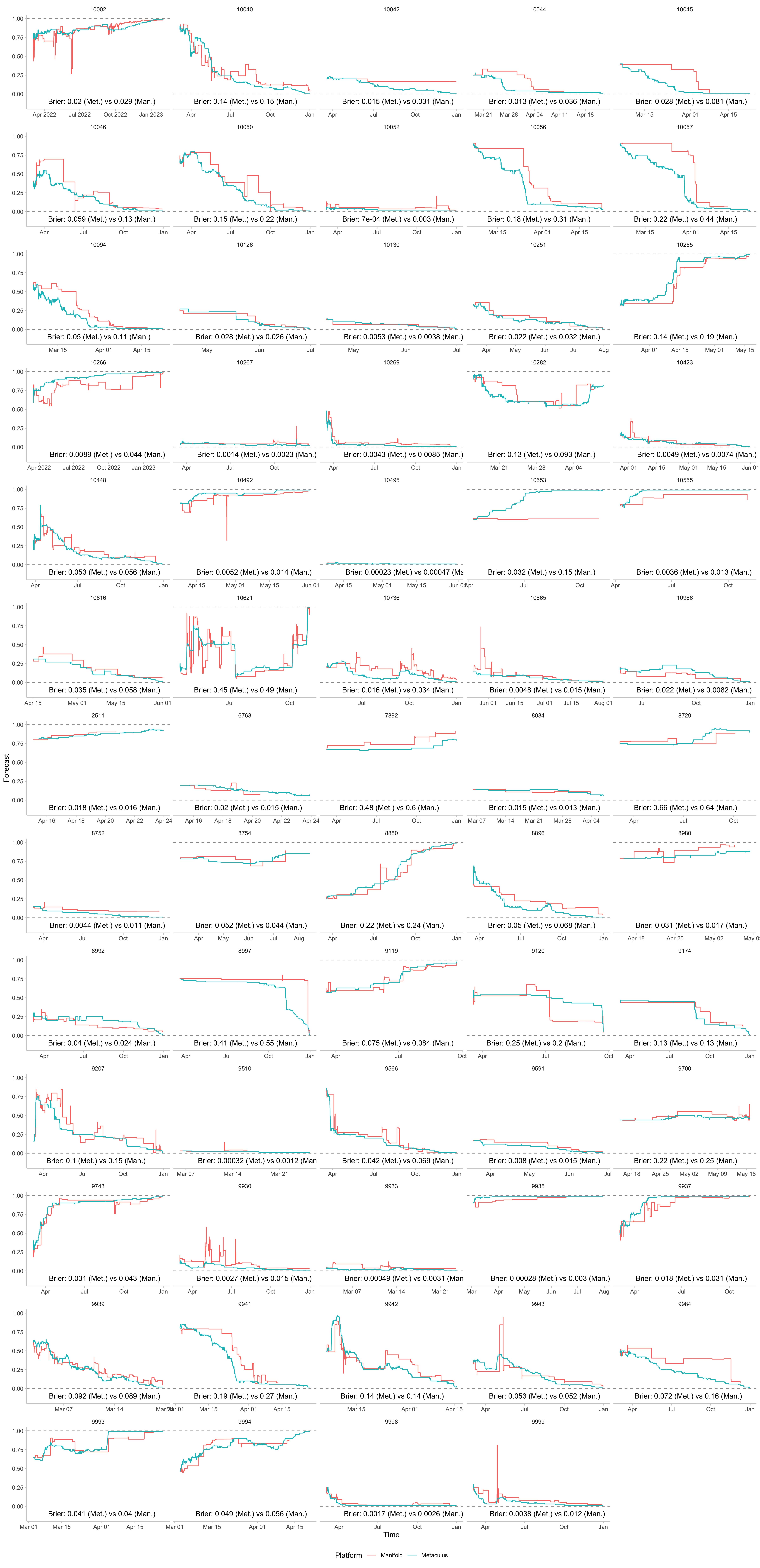 Let’s have another look at the actual forecasts. Here is a gigantic plot that shows the corresponding Manifold and Metaculus community prediction (as well as time-averaged scores) for all questions that I looked at.