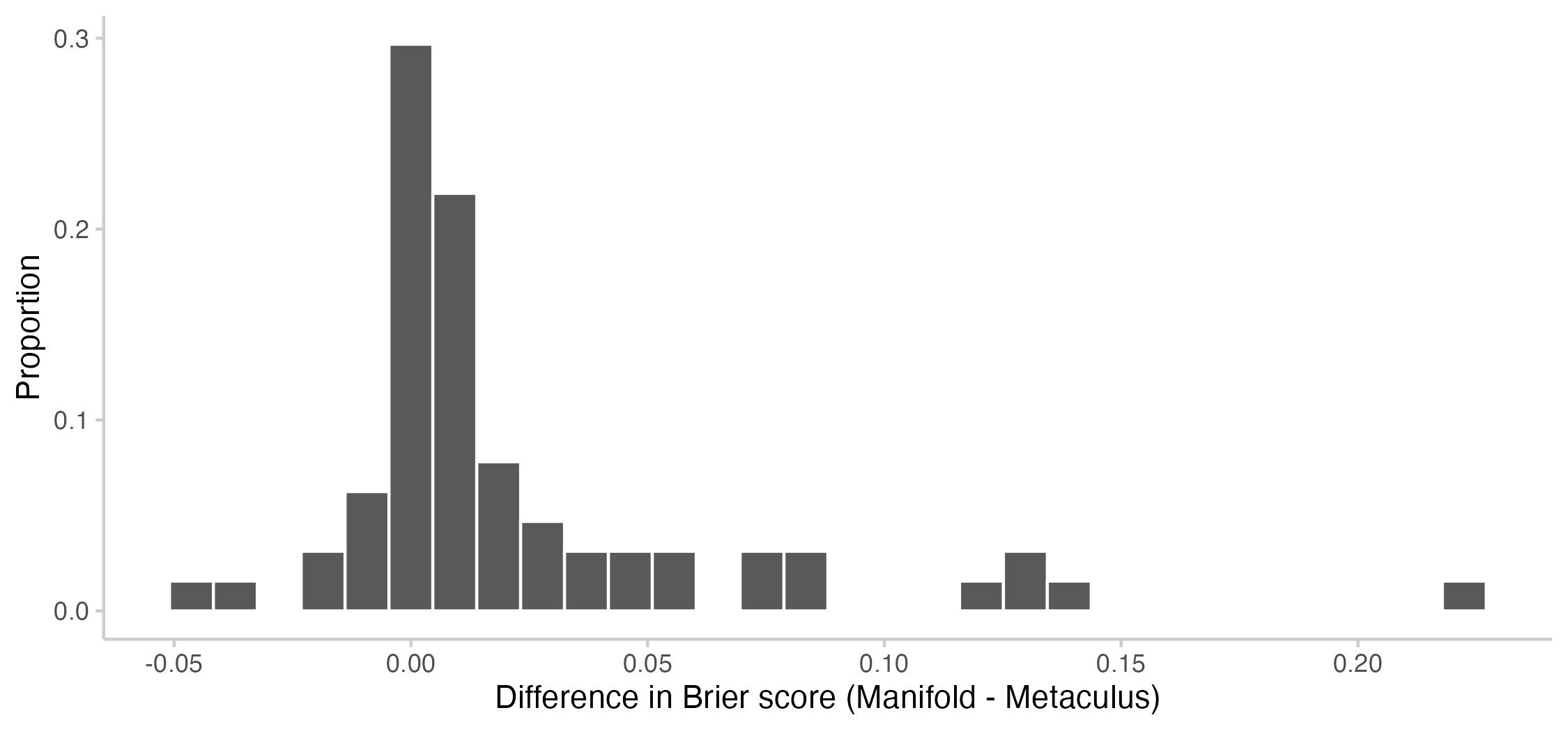 The mean Brier score was 0.084 for Metaculus and 0.107 for Manifold. This difference was significant using a paired test. Metaculus was ahead of Manifold on 75% of the questions (48 out of 64).