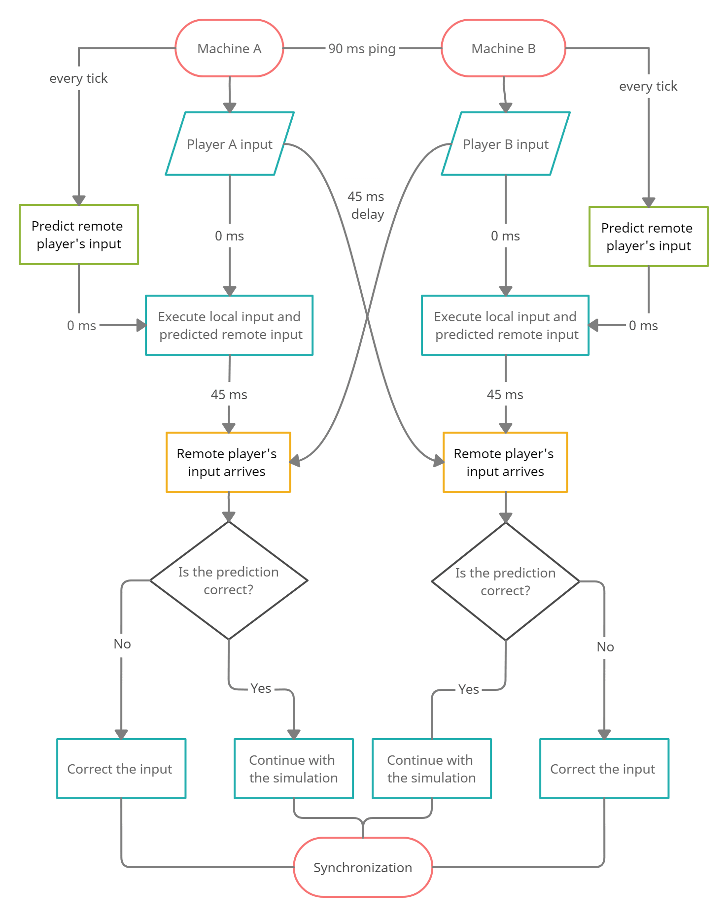 Fighting games present a particular challenge for online play: they require frame-perfect timing, where a single frame (1/​60th of a second) can determine whether you successfully block an attack or get hit. But network latency means information about your opponent’s actions arrives late, often 3–10 frames after they performed them.