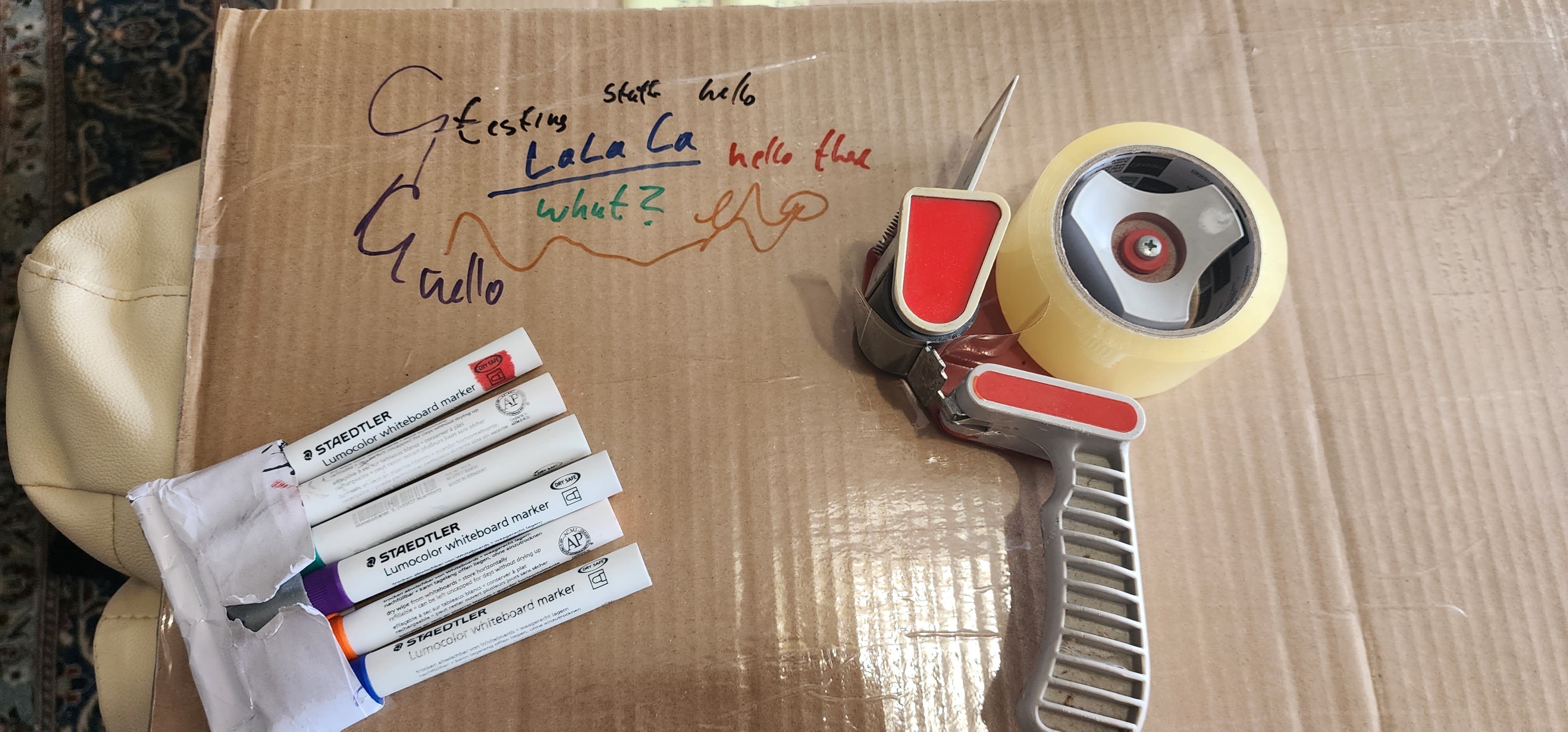 Ideally, put white paper between the cardboard box and the tape to get an actual white board.