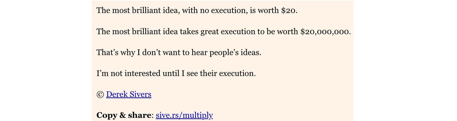 It’s hard to get value out of having an idea if you don’t execute it yourself, but that doesn’t mean it’s not valuable. When people do have a great idea and manage to execute on it, this can make them wildly successful. It’s true execution matters, but if you can do the execution yourself it seems like you clearly can get way more value out of it. We’d probably be in a much better situation if people were able to share ideas more freely without losing this value. Sharing an idea creates a positive externality, and that’s hard to capture.