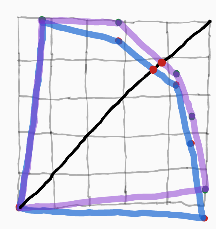 First, since chaaness is partially about not getting into destructive conflicts, any chaa point should be on the Pareto frontier. Namely, there shouldn’t be an alternative that leaves both players strictly better off. After all, if you have a prospective definition of “chaa” that demands that both players leave spare utility on the table, they should be able to take that as their new disagreement point, do another round of bargaining, and attain an outcome which is Not That and better for both. And then, this process would give you a new notion of chaaness that’s just strictly better for all agents to use. So, whatever point is selected, it must be from the upper-right boundary of the shape.