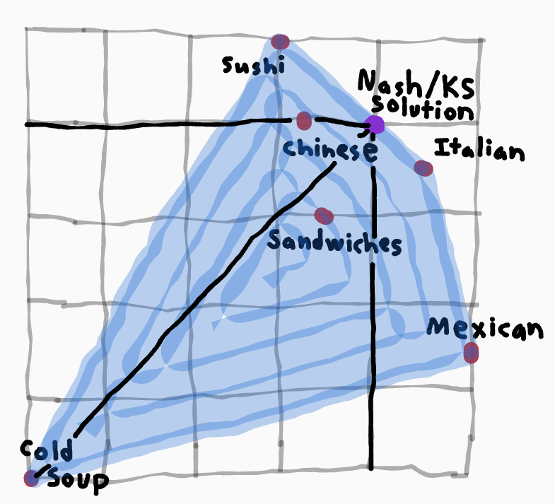 Also, both the Kalai-Smorodinsky and Nash bargaining solutions happen to agree on which point to pick in the restaurant game, namely, a 2⁄3 chance of italian food, and a 1⁄3 chance of sushi. Although these solutions don’t usually coincide.