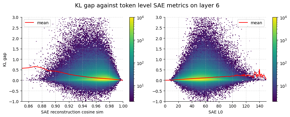 Training recipe: each of these SAEs are trained to have approximately the same average L0 loss (average number of features) and have the same fan-out width. In practice, I expect that the number of active features and the number of in-principle representable features to vary throughout network depth. The large variability in KL gap by layer is suggestive.