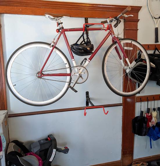 We also have two bike hooks on the wall. I put them in about four years ago, and they’ve worked well:
