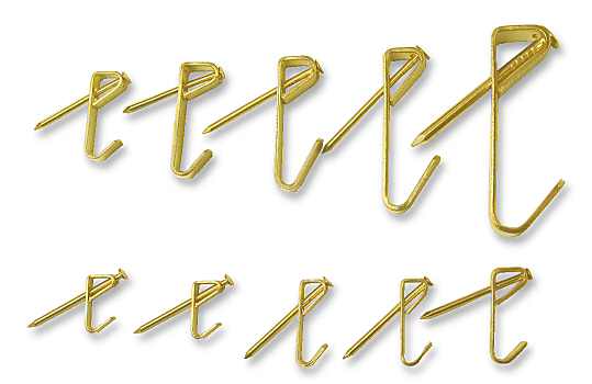 I responded about Command hooks in a subthread, but also recommend picture frame hangers (image below, since the term is somewhat ambiguous). They are not the most helpful/versatile shape, but they can hold quite a lot of weight with only a small nail hole.