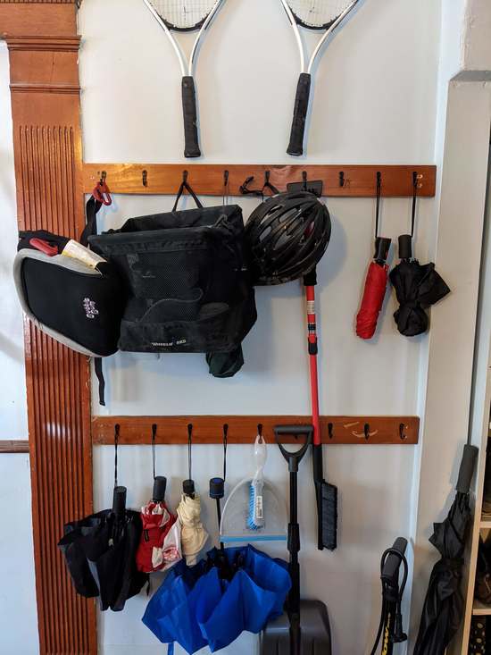 The entryway had gotten pretty messy, with a lot of things scattered on the horizontal surfaces. We decided to put up some hooks, to move things onto the vertical services. I used some trim that I’d saved from an earlier project, cut it to width, screwed it into studs, and attached hooks: