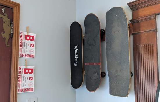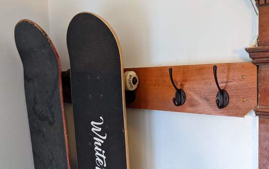 Each skateboard is on a pair of standard coat hooks, 4″ apart. Each pair is 6″ from the next. At some point if we want to hang some thing else there, the hooks are general purpose.