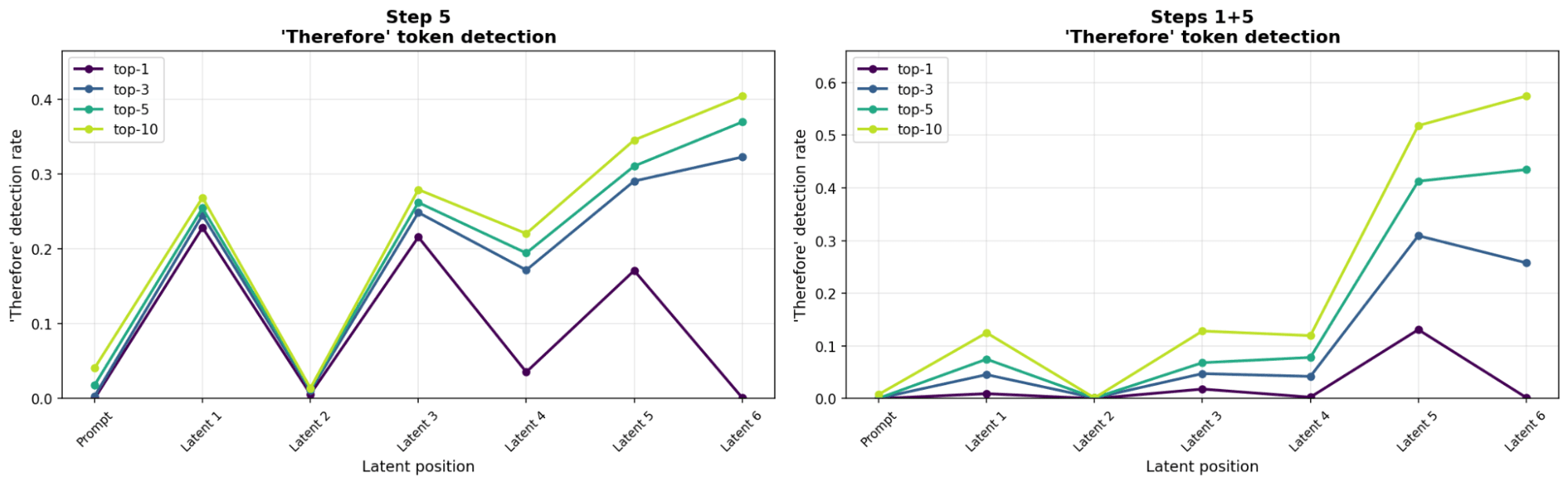 “Therefore” appears specifically after latent step 3, with detection rate increasing after latent 3 all the way up to 6 — suggesting step 3 and step 5 are qualitatively different despite both being odd computation steps