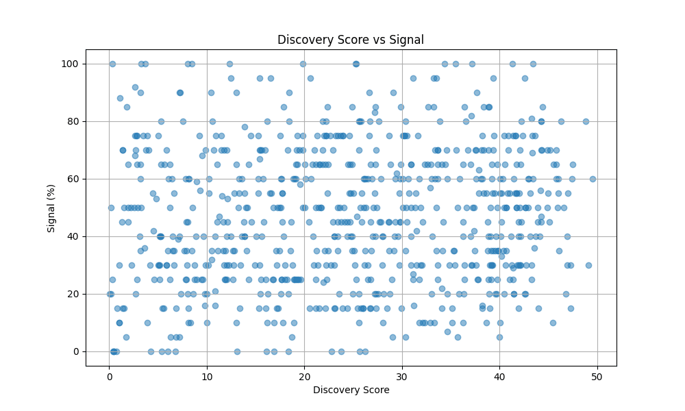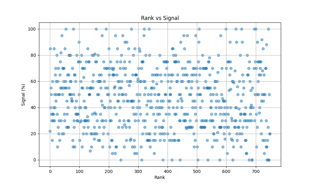 The Lack of Correlation Between Rank and Discovery Lastly, we examine and find that neither rank or discovery score appear to correlate with signal, which suggests that it’s possible that the LLM signal rating is more random, however my personal spot checks (Andrej Karpathy, Lilian Weng, Sam Altman) seem about correct.