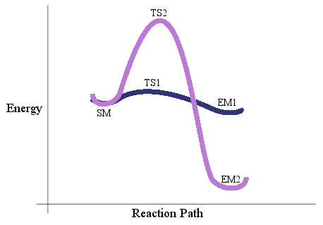 The main takeaway from Figure 1 is that reactions which produce the most stable end materials, like ending material 2, from a given set of starting materials aren’t always the reactions which are easiest to make happen.