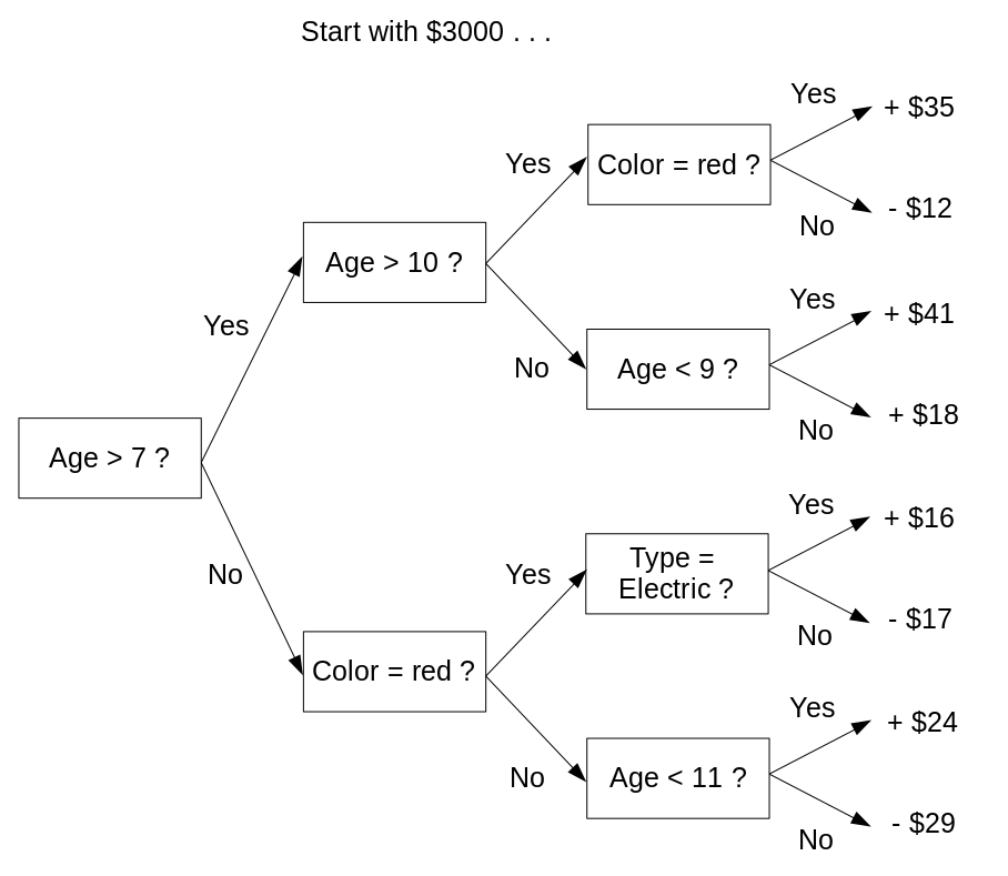 “When estimating the price of a car, start with $3000, add $2000 if it’s electric, subtract $1000 if it’s diesel, add $50 if it has a red paint job, add $100 for every point in its fuel economy rating, and subtract $450 for every year it’s been on the market.”