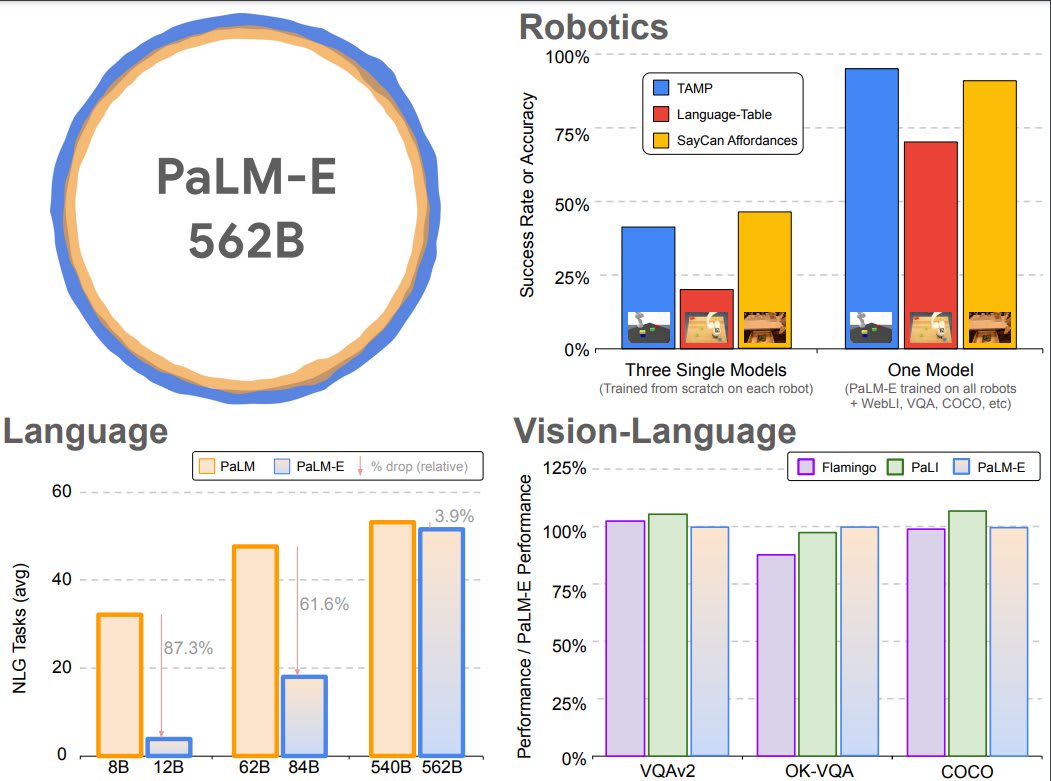 Large language models have been demonstrated to perform complex tasks. However, enabling general inference in the real world, e.g. for robotics problems, raises the challenge of grounding. We propose embodied language models to directly incorporate real-world continuous sensor modalities into language models and thereby establish the link between words and percepts. Input to our embodied language model are multi-modal sentences that interleave visual, continuous state estimation, and textual input encodings. We train these encodings end-to-end, in conjunction with a pre-trained large language model, for multiple embodied tasks, including sequential robotic manipulation planning, visual question answering, and captioning. Our evaluations show that PaLM-E, a single large embodied multimodal model, can address a variety of embodied reasoning tasks, from a variety of observation modalities, on multiple embodiments, and further, exhibits positive transfer: the model benefits from diverse joint training across internet-scale language, vision, and visual-language domains. Our largest model, PaLM-E-562B with 562B parameters, in addition to being trained on robotics tasks, is a visual-language generalist with state-of-the-art performance on OK-VQA, and retains generalist language capabilities with increasing scale.