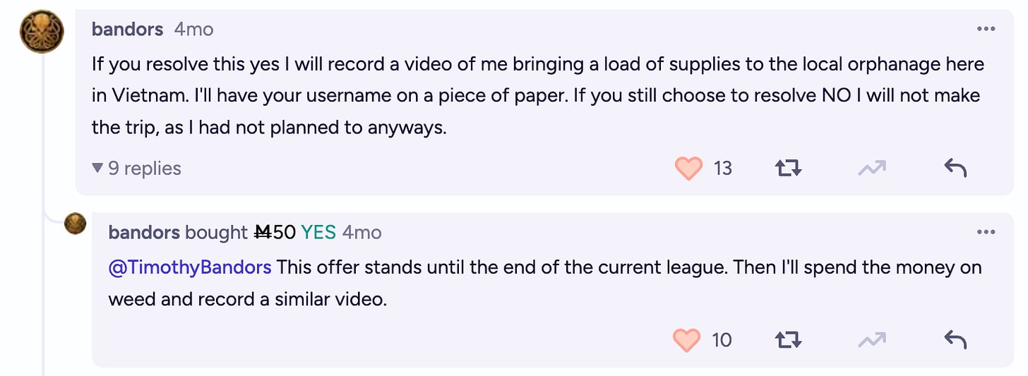 Another user promised to bring supplies to his local orphanage in Vietnam with a YES resolution, or to spend the money on illicit substances in response to a NO resolution.