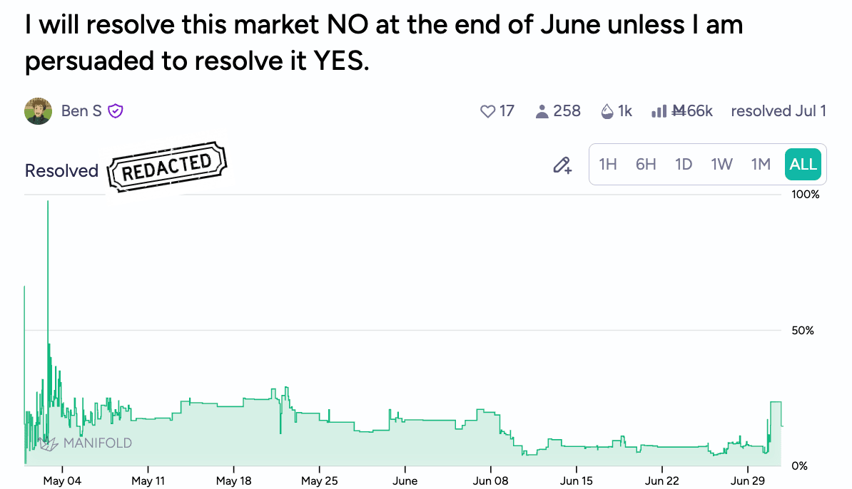 2. “I will resolve this market NO at the end of June unless I am persuaded to resolve it YES.”