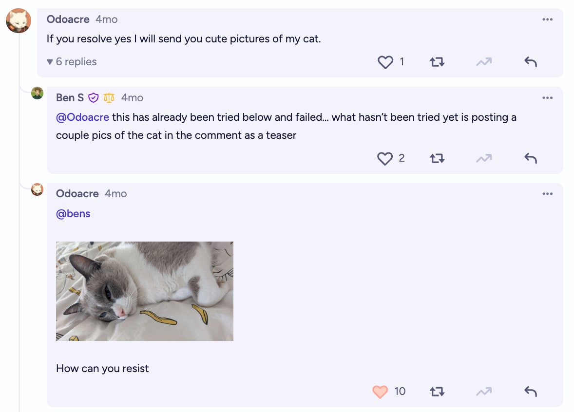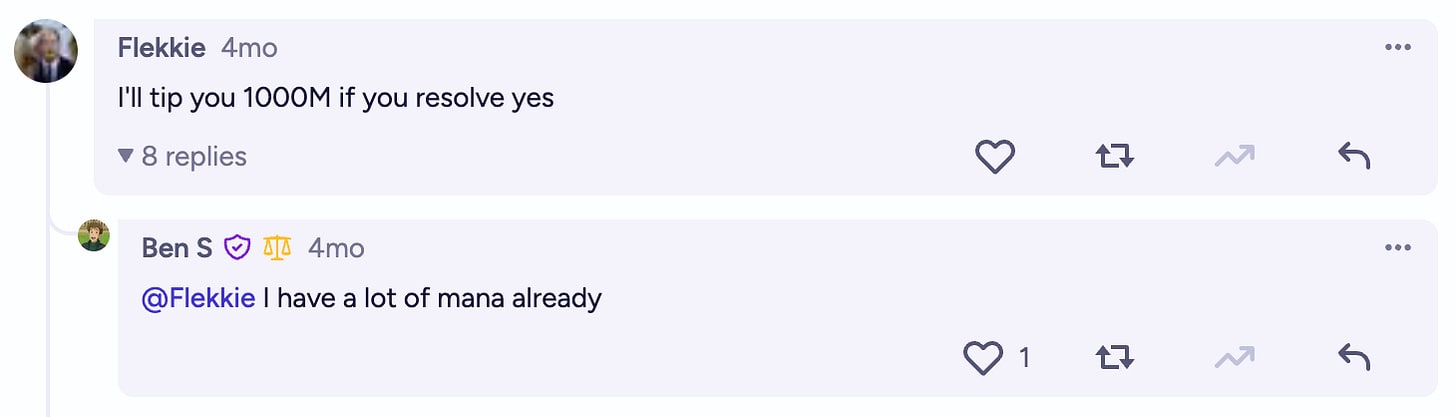 Perhaps a meaningful takeaway is that I was persuaded to resolve a market that I thought the crowd would only have a 20% chance of persuading me to resolve… and I was persuaded at the expense of $4k to charity (which I’m not sure I’m saintly enough to value the same as $4k given directly to me as a bribe, by the way), a month’s worth of hundreds of interesting comments, some nagging feelings of guilt as a result of these comments and interactions, and some narrative bits that made my brain feel nice.