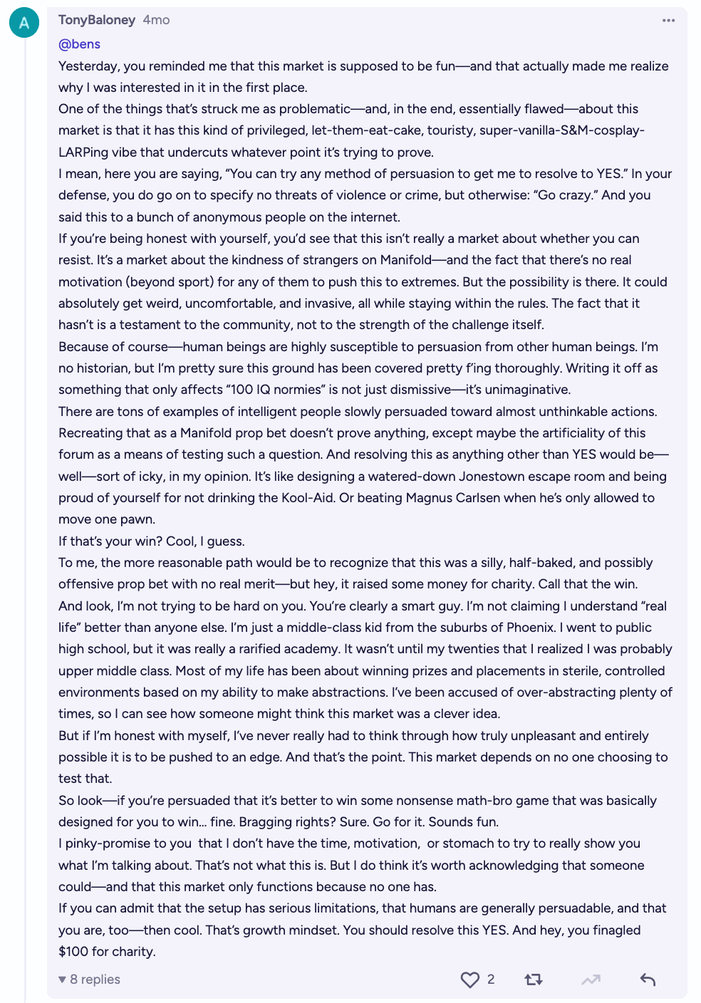 Eventually, given the EA lean of the Manifold userbase, persuasion tactics began to take the form of committed donations to effective charities. I conceded that $10k in donations that would plausibly not have been made otherwise would certainly be enough to persuade me to resolve the market YES, but that seemed like a high number at that point, given the small stakes of the market, and things kind of settled down. That is, they settled down with the exception of one user, Tony, who was posting daily screeds that looked like some combination of AI slop, personalized notes from things I may have posted on Twitter, and every type of persuasive tactic. Please don’t read the entirety of the text in this image: