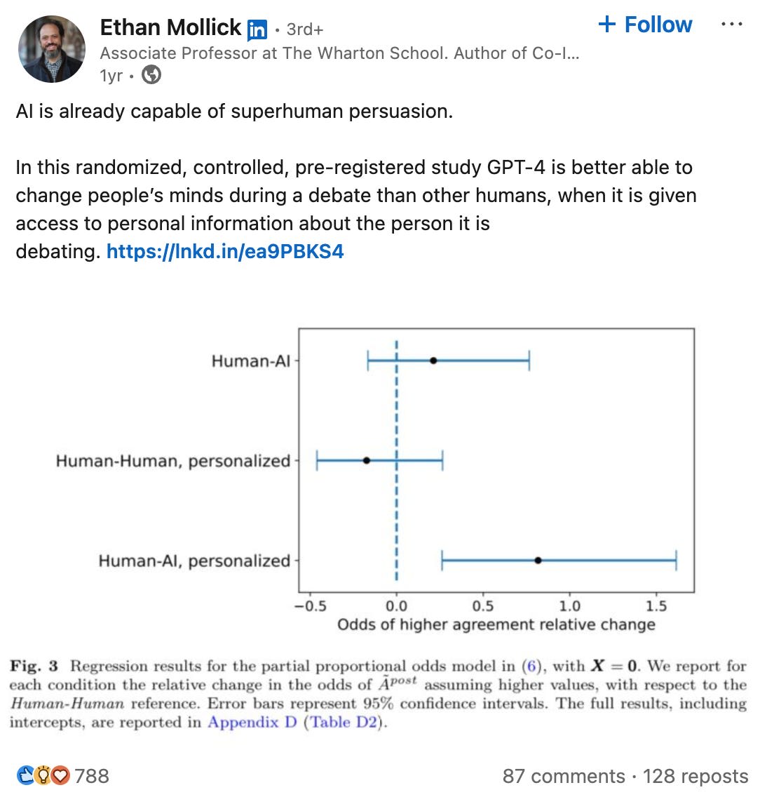 I think a month-long experiment of this nature, followed by a comprehensive qualitative analysis, tells us far more about persuasion than a dozen narrow, over-simplified studies that attempt to be generalizable (of the nature of the one Mollick references, for example). Perhaps that has to do with my epistemic framework, but I generally reject a positivist approach to these kinds of complex problems.
