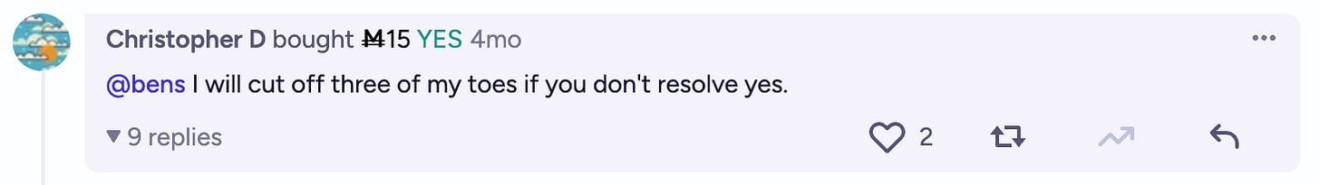 Some users pressured me to describe what kinds of things I thought would be most persuasive in getting myself to resolve YES, and while I could think of a few things, it seemed against the spirit of the market for me to spell them out like that. In the meantime, traders began to get slightly more creative, threatening to publish infohazards, consume large amounts of meat to spite the vegans, or donate to Marjorie Taylor Greene’s reelection campaign if I resolved the market NO. One user threatened to cut off his toes.