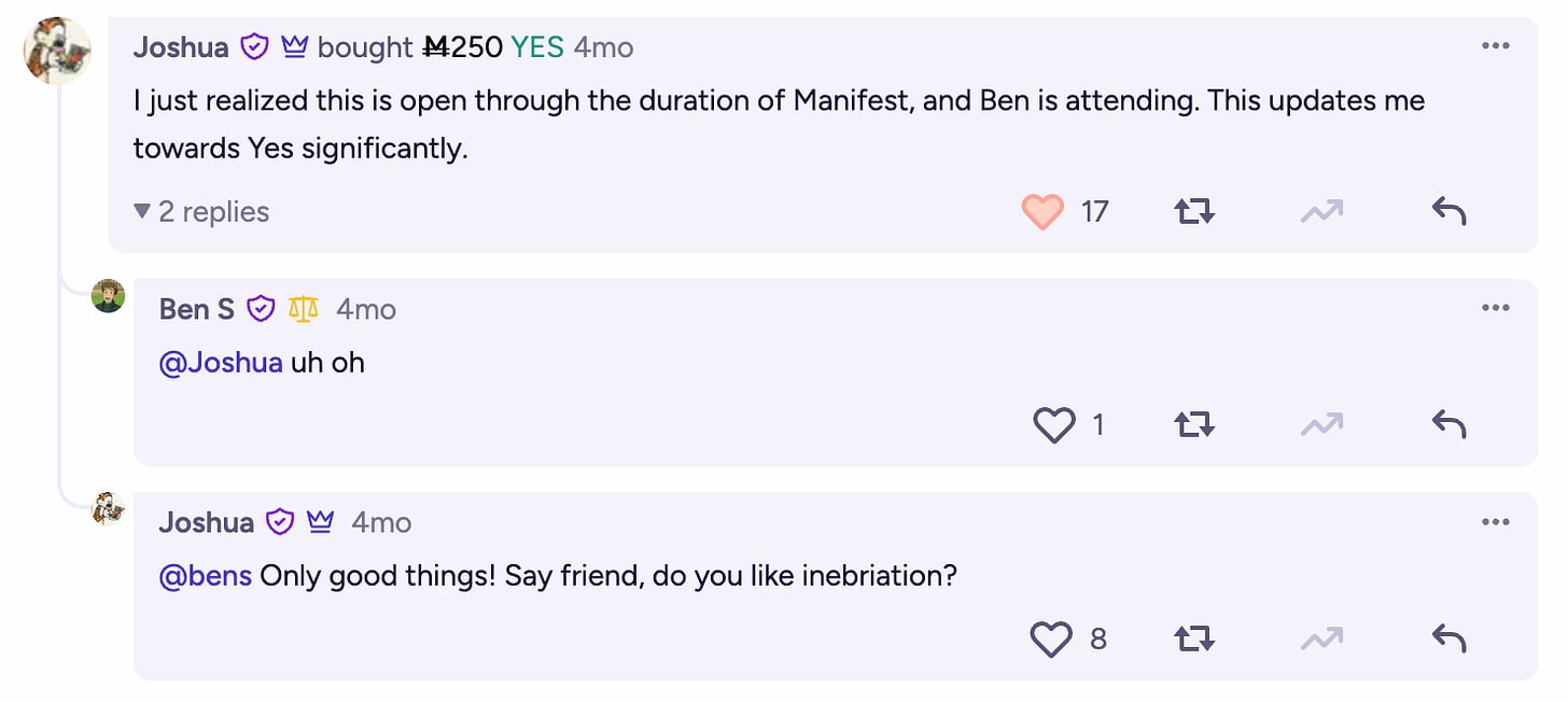 Trying a different tact, another user, after going through my Twitter, suggested large donations to effective charities and offered to organize a sprawling game of hide-and-seek at the prediction market conference I was planning to attend the following month. Famed prediction market whale, Joshua, also realized that the duration of the market overlapped with that conference, Manifest.