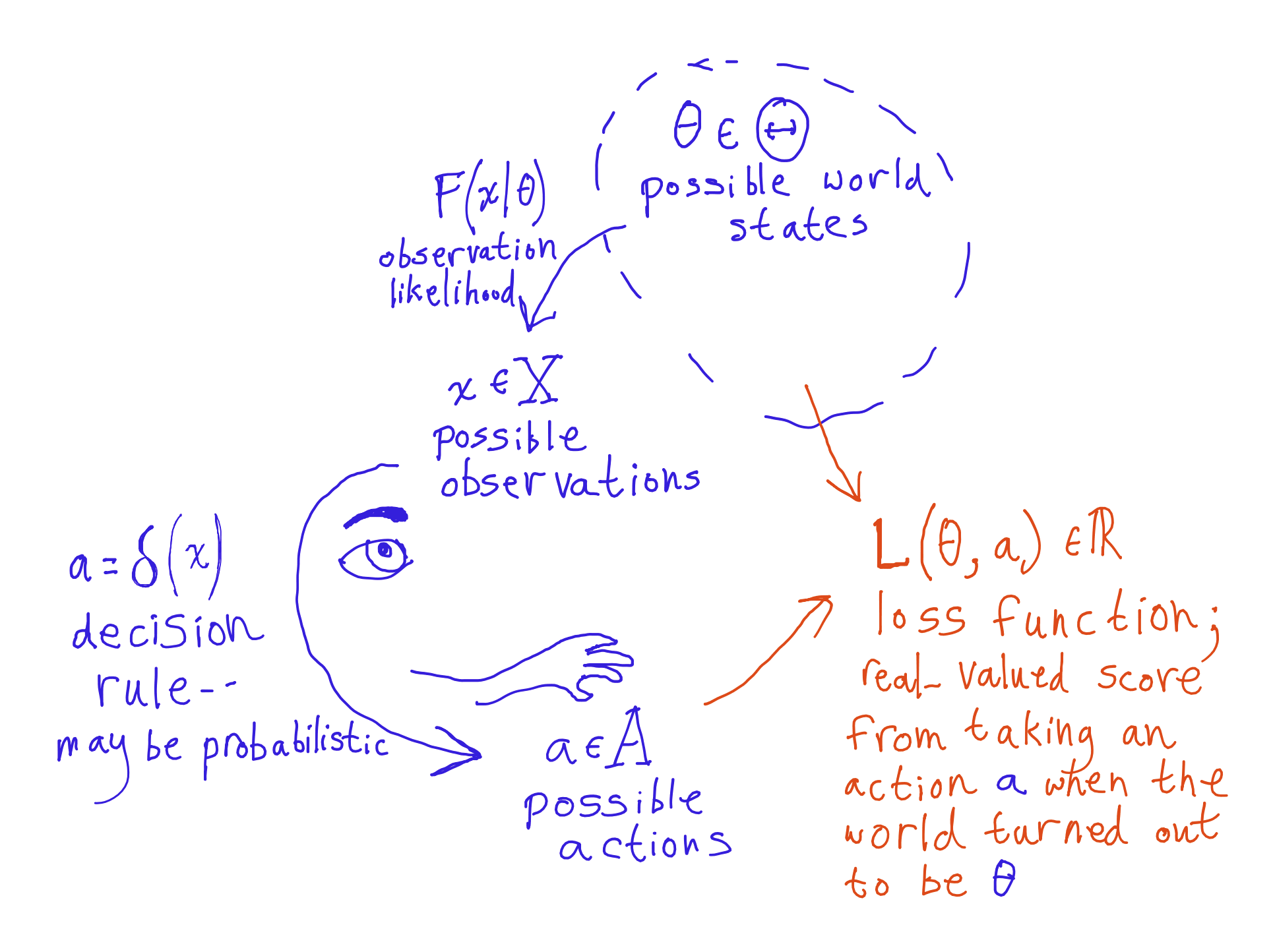 , the loss function, takes a world and an action and returns a real-valued “loss”. encodes preferences: the lower the loss, the better. One way of thinking about this is that the agent knows how its actions play out in each possible world; the agent is only uncertain about consequences because it doesn’t know which possible world is the case.