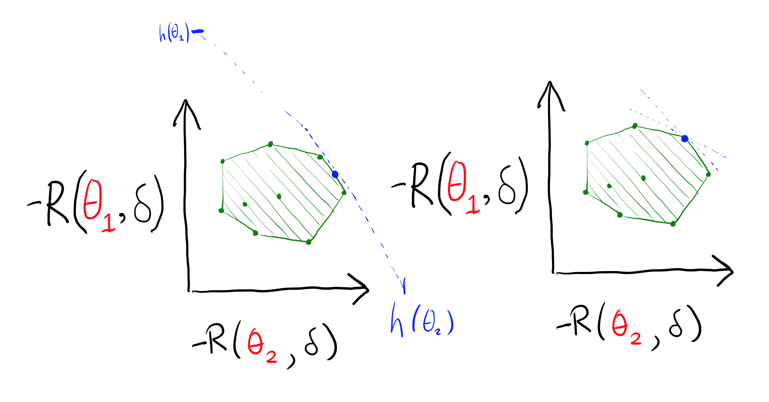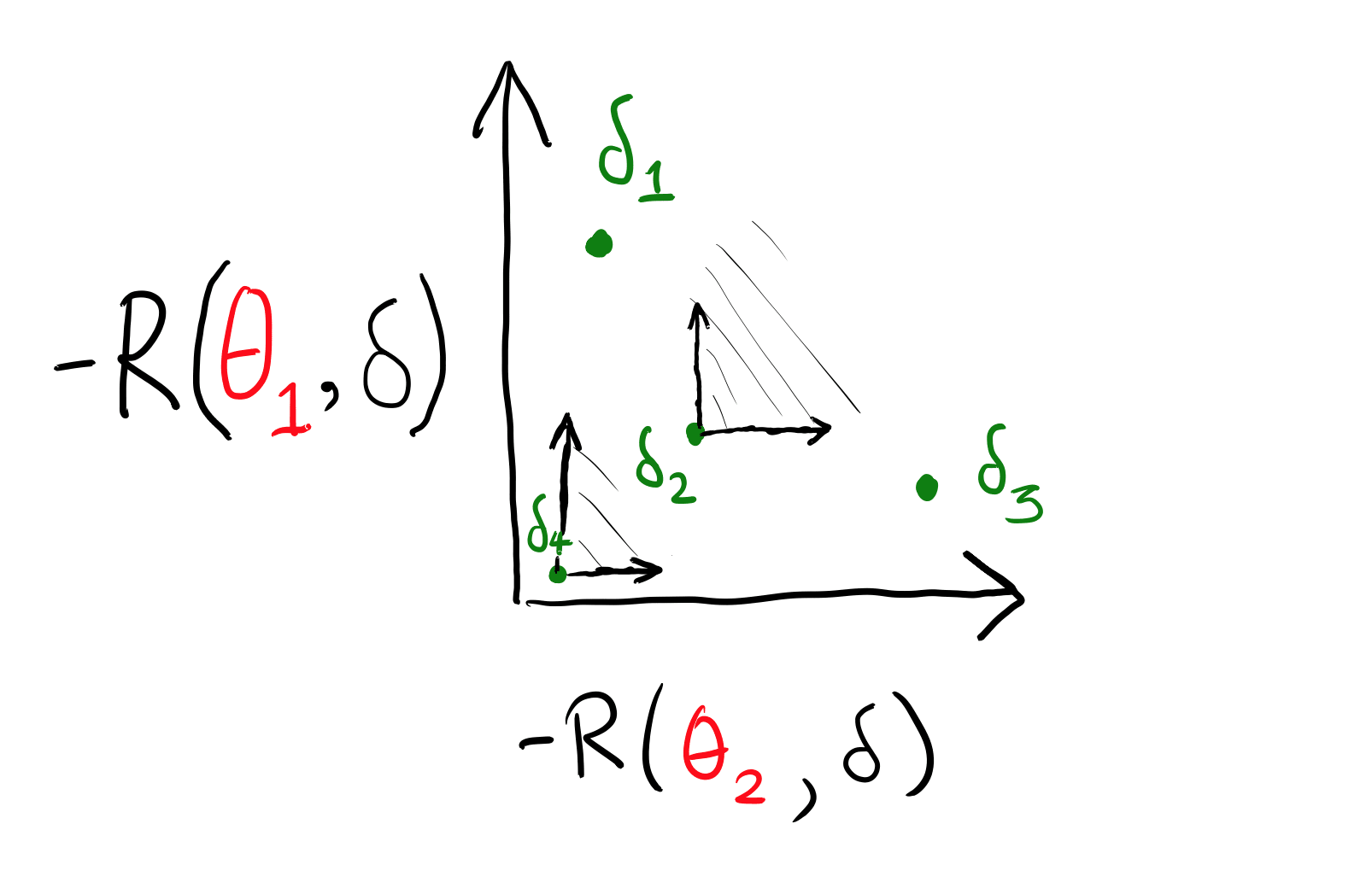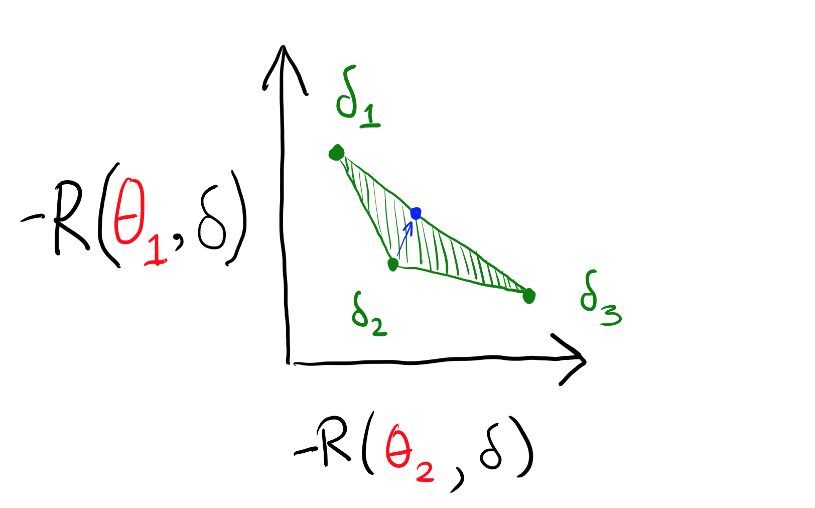 The black “corners” coming from and show the beginning of the Q() set for those two points. (You can imagine the other two, for and .) Nothing is pareto-dominated except for , which is dominated by everything. In economics terminology, the first three actions are on the pareto frontier. In particular, is not pareto-dominated. Putting some numbers to it, could be worth (2,2), that is, worth two in each world. could be worth (1,10), and could be worth (10,1). There is no prior over the two worlds in which a Bayesian would want to take action . So, how do we rule it out through our admissibility requirement? We add mixed strategies: