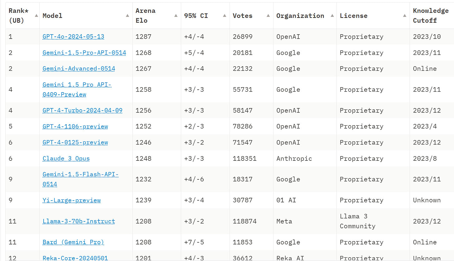 – Gemini 1.5 Pro/Advanced at #2, closing in on GPT-4o